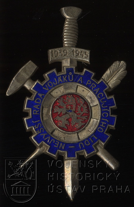 Jednostranný odznak o výšce 72 mm a šířce 45 mm je zhotovený ze stříbra a slitiny bílého kovu. Na středu v kruhovém červeně smaltovaném medailonu se nachází stříbrný lev z malého státního znaku Československé republiky, lemovaný mezikružím rozděleným plastickými loukotěmi kola a uzavřený okrajem v podobě modře smaltovaného ozubeného kola s opisem: NEJVYŠŠÍ RADA VOJÁKU A PRACUJÍCÍHO LIDU. Medailon v kolmém směru podložen hrotem dolů orientovaným římským mečem, jehož záštita nese rytý letopočet: 1939−1945. Medailon je dále podložen kosmo orientovaným kladivem, zkříženým s šikmo položeným psacím brkem. Revers hladký s vertikálně orientovanou připínací jehlicí.