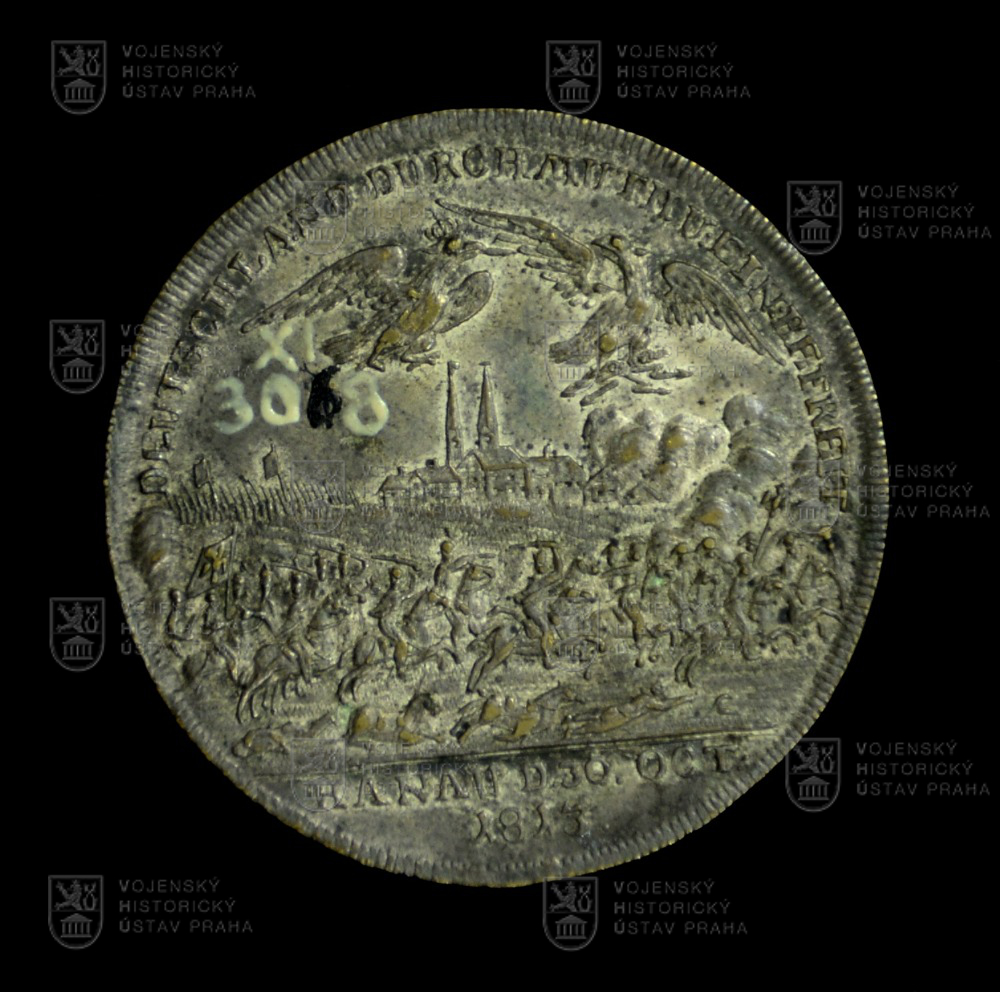 Na reverzu je v celé ploše znázorněna veduta bitvy u Hanau, doplněná o opis DEUTSCHLAND DURCH MUTH U[ND] EIN[HEIT] BEFREIT (Německo osvobozeno díky odvaze a jednotě) a nápis s datací HANAU D. 30. OCT 1813 vespod. Nad bojištěm jsou ve vzájemném souboji znázorněni dva orli.