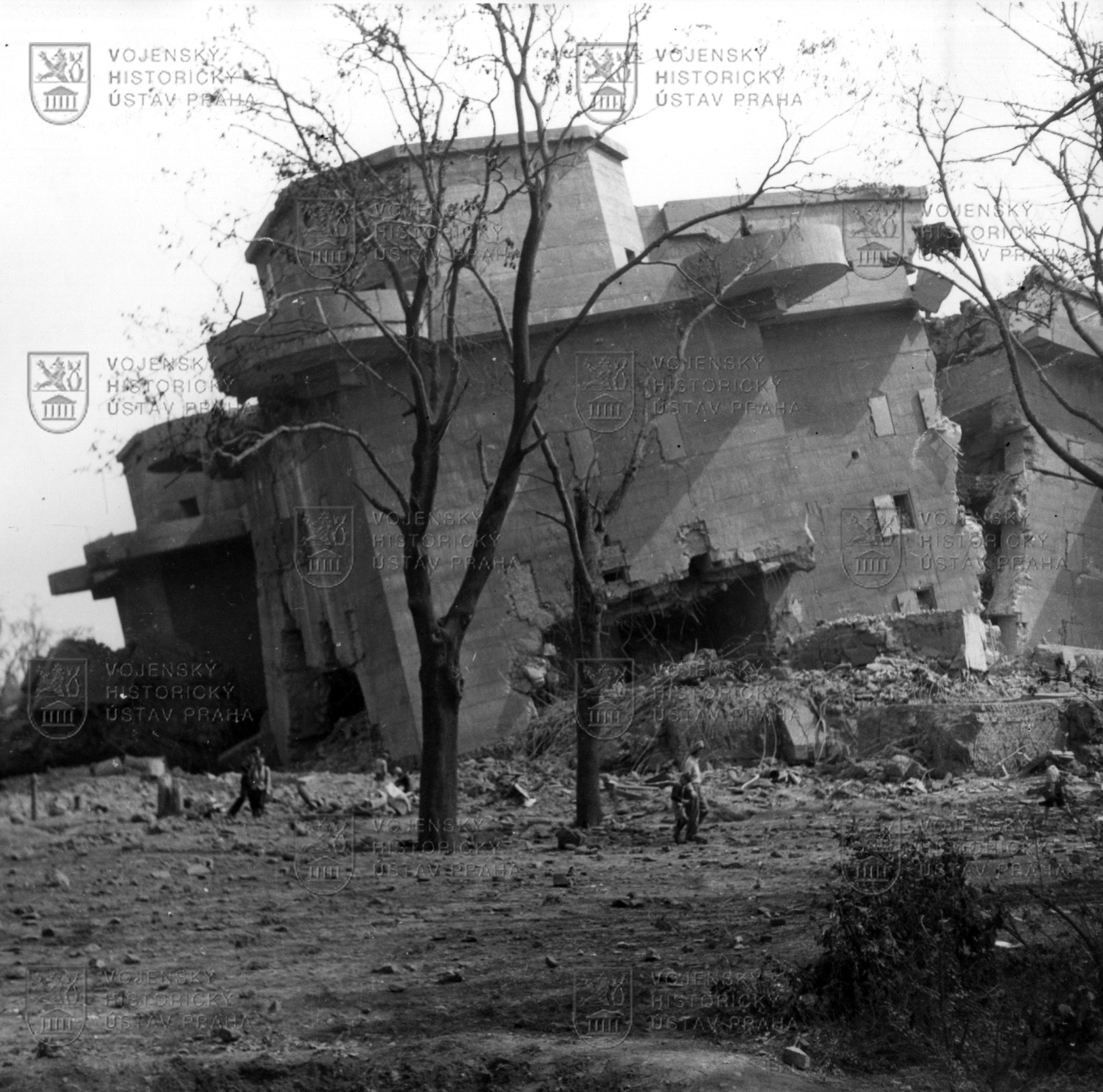 Snímek byl pořízen nedlouho po 28. únoru 1948, kdy byla věž spojeneckými okupačními silami částečně odstřelena. Od úplného zničení ji uchránilo nedaleké nádraží, protože při úplném odstřelu hrozilo jeho poškození. Následně došlo k částečnému zasypání věže sutí z okolních budov poničených během války.