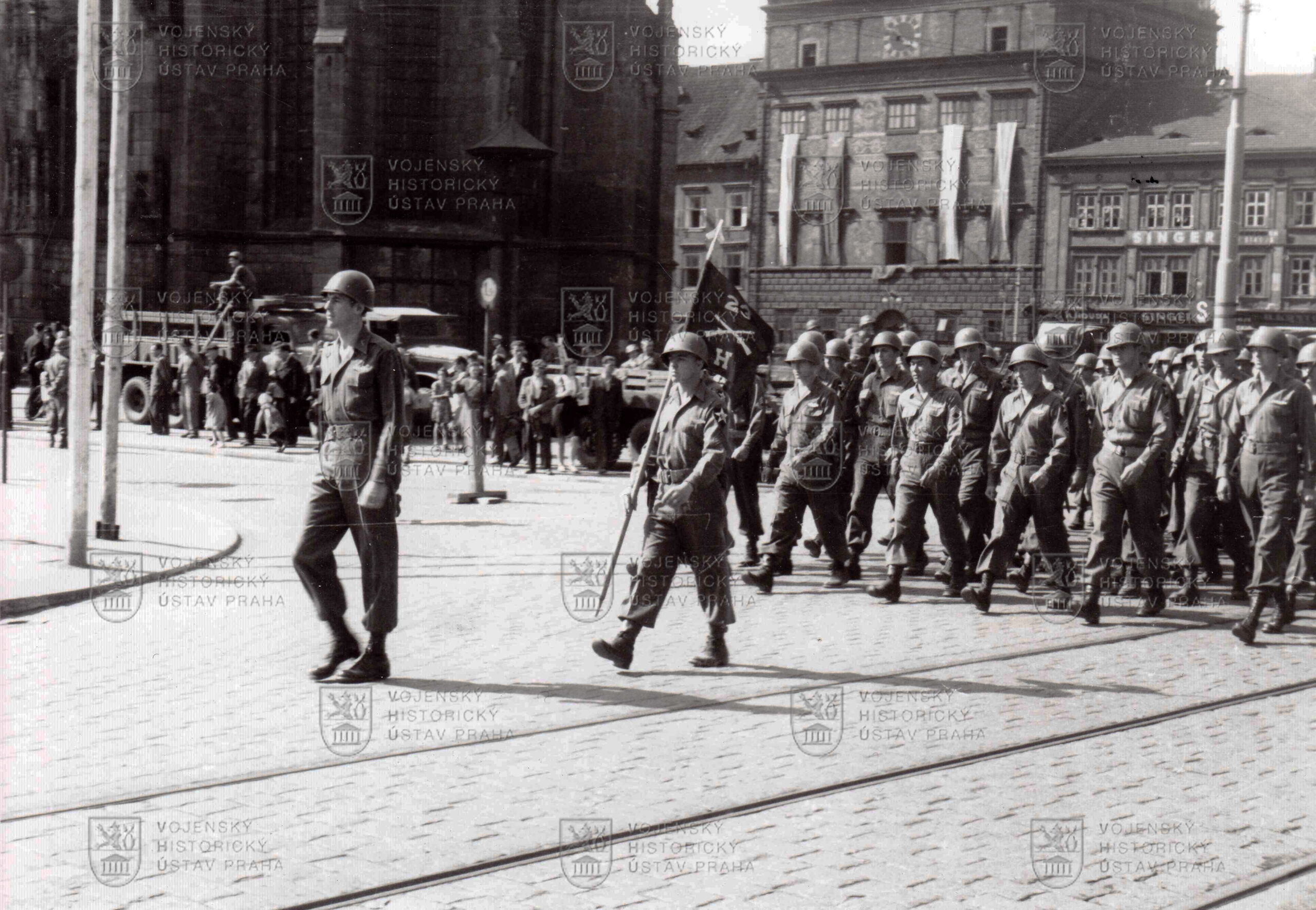 Snímek z nástupu příslušníků 2. pěší divize Armády Spojených států amerických byl pořízen během slavnostní recepce v Plzni 13. května 1945. Generálmajor Walter M. Robertson, velitel 2. pěší divize, hostil tehdy ve svém štábu generálporučíka tankových sil Michaila Ivanoviče Saveljeva, velitele sovětského 5. gardového tankového sboru.