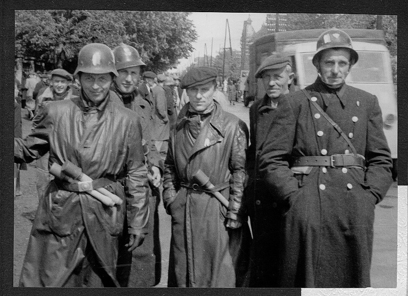 I přes skutečnost, že České národní povstání bylo dlouhodobě připravováno a vojensky řízeno, trpělo od počátku nedostatkem materiálu, zejména zbraní. Vzhledem k těžce vyzbrojenému nepříteli bylo nutné bojující vybavit i dalším podpůrným materiálem. Povstalci byli nuceni všemožně improvizovat, a to i v případě přileb. Ty již od první světové války sloužily jako základní ochrana hlavy proti střepinám a dalším úlomkům a stále jsou nepostradatelnou součástí nejen vojenské ochranné výstroje. Mezi povstalce se dostalo velké množství přileb tzv. Luftschutzu (protiletecké ochrany), bývalé CPO, z hasičských zbrojnic i kořistních přileb německých sil. Byly většinou okamžitě opatřovány československými vlajkami nebo trikolórami pro rozpoznání od Němců. Formy označování byly různé, nejčastěji nátěrem barvami, nebo nalepením čs. symbolů. Zde se jedná o přilbu vz. 23/35 z výzbroje bývalé francouzské armády, která byla jako kořistní (po odstranění znaku z čela přilby) zařazena do výstroje Luftschutzu a doplněna za povstání zajímavou povstaleckou bikolórou. Dále se jedná o německou přilbu vz. 35, původně používanou všemi ozbrojenými složkami německých ozbrojených sil a doplněnou povstalci o několik typů čs. symboliky.
