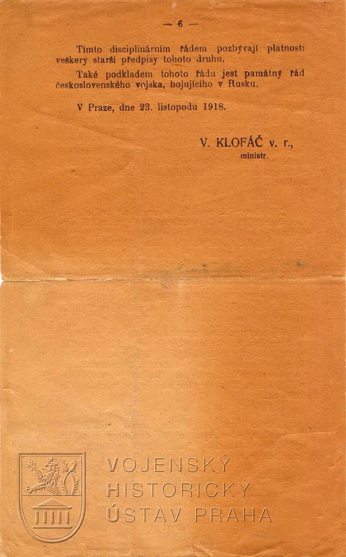 Po rozpadu Rakousko-Uherska a vzniku Československé republiky v říjnu 1918 se na základě stávajících rakousko-uherských a nově tvořených dobrovolnických jednotek začalo formovat československé domácí vojsko. Památkou na toto období je prozatímní disciplinární řád, který první československý ministr národní obrany Václav Klofáč schválil dne 23. listopadu 1918. Tento řád nahrazoval obdobné předpisy rakousko-uherské armády a svým zněním vycházel z disciplinárního řádu, který pro potřeby československého vojska na Rusi vydala ruská odbočka Československé národní rady v Kyjevě.
