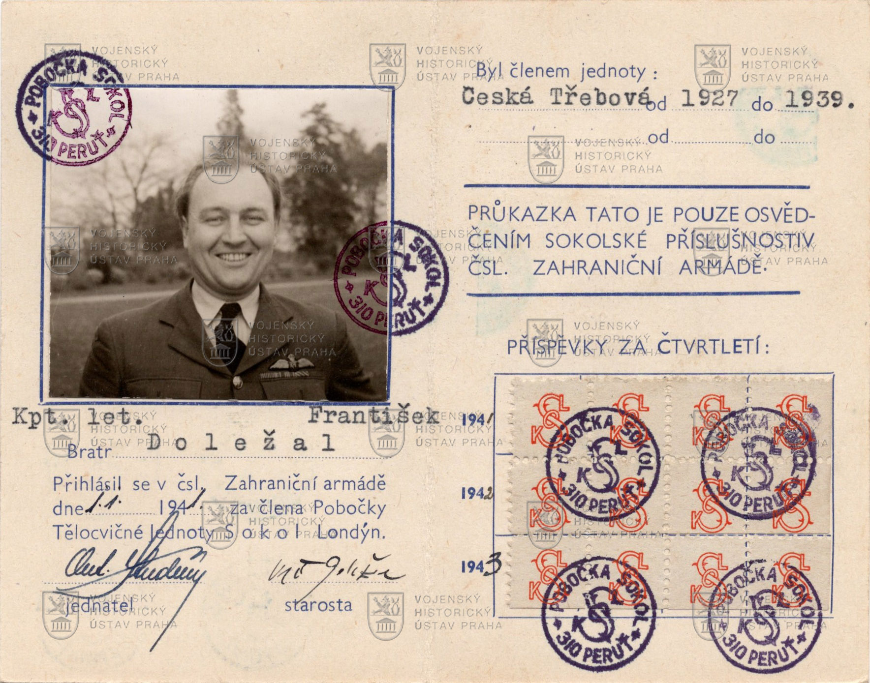 Sokolská legitimace z tohoto období má podobu jednoduchého přehnutého listu z tvrdého papíru. Uvnitř se nachází základní údaje o majiteli včetně jeho předchozí sokolské příslušnosti, dále vlepená fotografie a kupony dokládající čtvrtletní příspěvky, na zadní straně je pak text sokolského slibu. František Doležal si pro svou legitimaci pořídil navíc ještě jednoduché papírové desky.