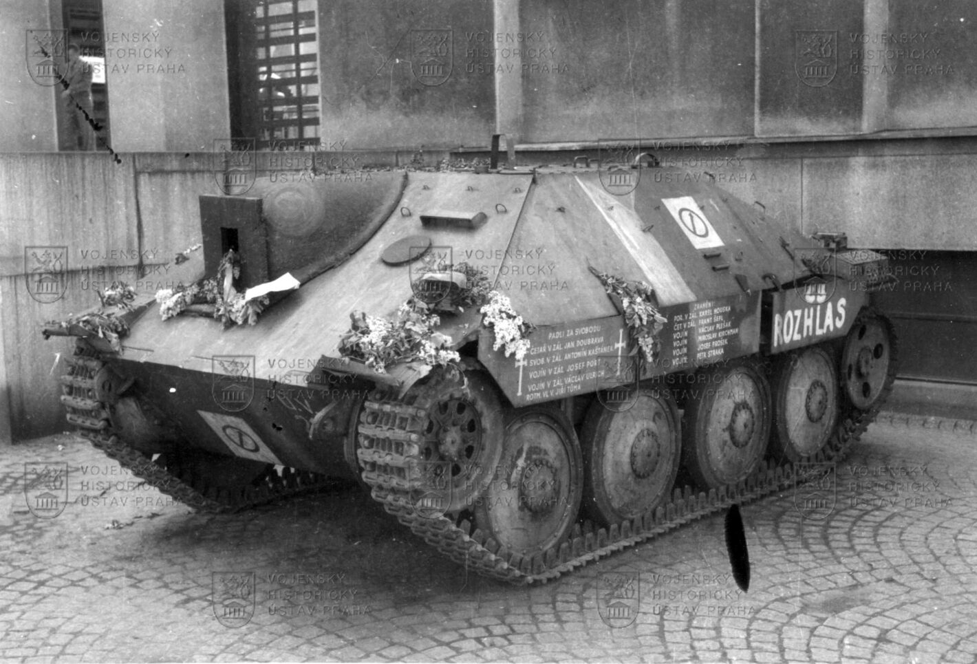 Když dne 5. května 1945 vypuklo v Praze povstání proti nacistickým okupantům, podařilo se povstalcům ukořistit i jistý počet kusů těžké techniky – jednalo se mimo jiné o neúplné stíhače tanků Jagdpanzer 38(t) „Hetzer“. Stíhače tanků neměly instalované kanony, a tak byly otvory pro jejich instalaci improvizovaně uzavřeny ocelovými deskami se střílnou pro kulomet.