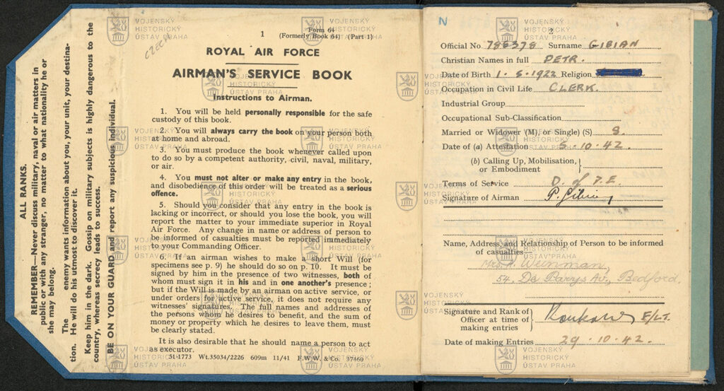 Prezentovaná vojenská knížka náležela československému letci židovského původu Petru Gibiánovi (1. 5. 1922, České Budějovice – 16. 9. 2008, Praha). Gibián do zahraničí odešel bez předchozích vojenských zkušeností již ve svých 17 letech a v červenci 1942 byl odveden do československé armády. V říjnu téhož roku vstoupil do RAF. Po dokončení výcviku byl v listopadu 1943 zařazen jako radiotelegrafista a palubní střelec k 311. čs. bombardovací peruti.