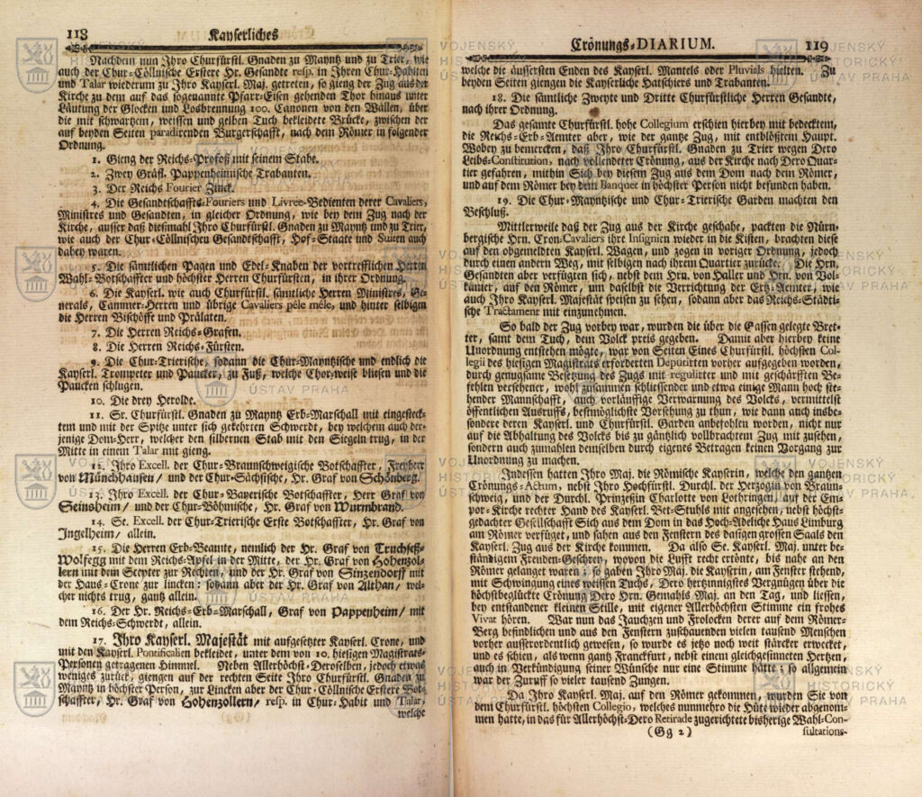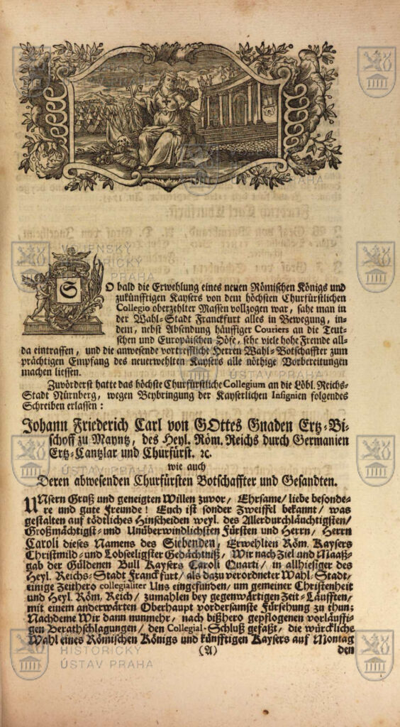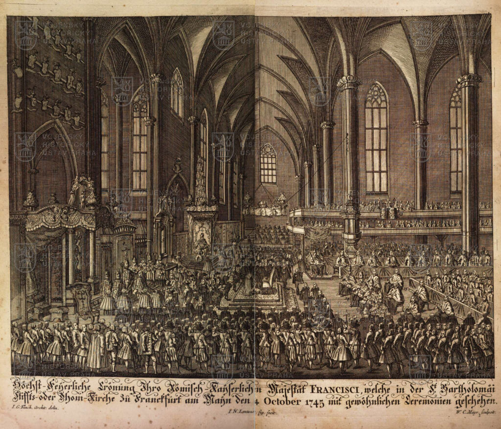 Vollständiges Diarium Von der Höchst- beglückten Erwehlung Des Allerdurchlauchtigsten Großmächtigsten und Unüberwindlichsten Fürsten und Herrn, Herrn Franciscus Königs zu Jerusalem, Herzogs zu Lothringen und Baar, Groß- Herzogs zu Toscana, Herzogs zu Calabern, Geldern, Montferrat, in Schlesien, zu Teschen, Fürsten zu Charleville, Marggrafen zu Pont a Moussan und Nomeny, Grafen zu Provintz Vaudemont, Blanckenburg, Zütphen, Taarwerden, Talm und Falckenstein, etc. etc: Zum Römischen König und Kayser Worin die Merckwürdigsten Handlungen und Begebenheiten enthalten, Mit Kupfferstichen und Schematischen Vorstellungen versehen Nebst einer Vorrede, Von den Vorzügen des Regierenden Hauses bey den Teutschen Königs- und Kayser- Wahlen. Franckfurt am Mayn: Johann David Jung, 1746.