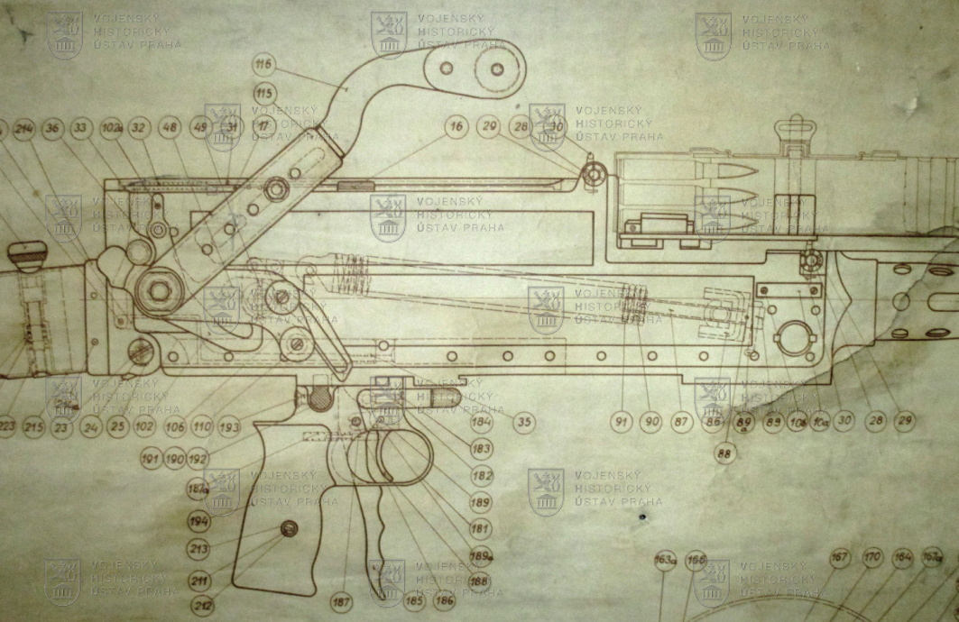 Výukový nástěnný obraz, postrádající označení zbraně, tvoří výkres bokorysu a nárysu pozorovatelského provedení s naznačeným diskovým zásobníkem, ve spodní části je řez pilotním synchronizovaným provedením. Sestavu výkresu doplňuje zobrazení výměnného pistolového spušťadla, řez závorníkem, příčný řez pásovým podavačem a detail řezu upevnění nástavce pro cvičnou střelbu. Výkres je signován konstruktérem Adolfem Sýkorou (1901–1959) a nese datum 31. září 1934.