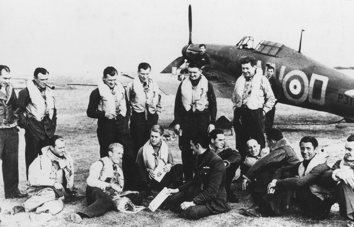 Na začátku července 1940 vypukla Bitva o Británii. V řadách RAF se jí účastnili i stovky Čechoslováků. Na snímku jsou zachyceni piloti 310. čs. stíhací perutě, za nimi jejich Hurricane Mk.I.