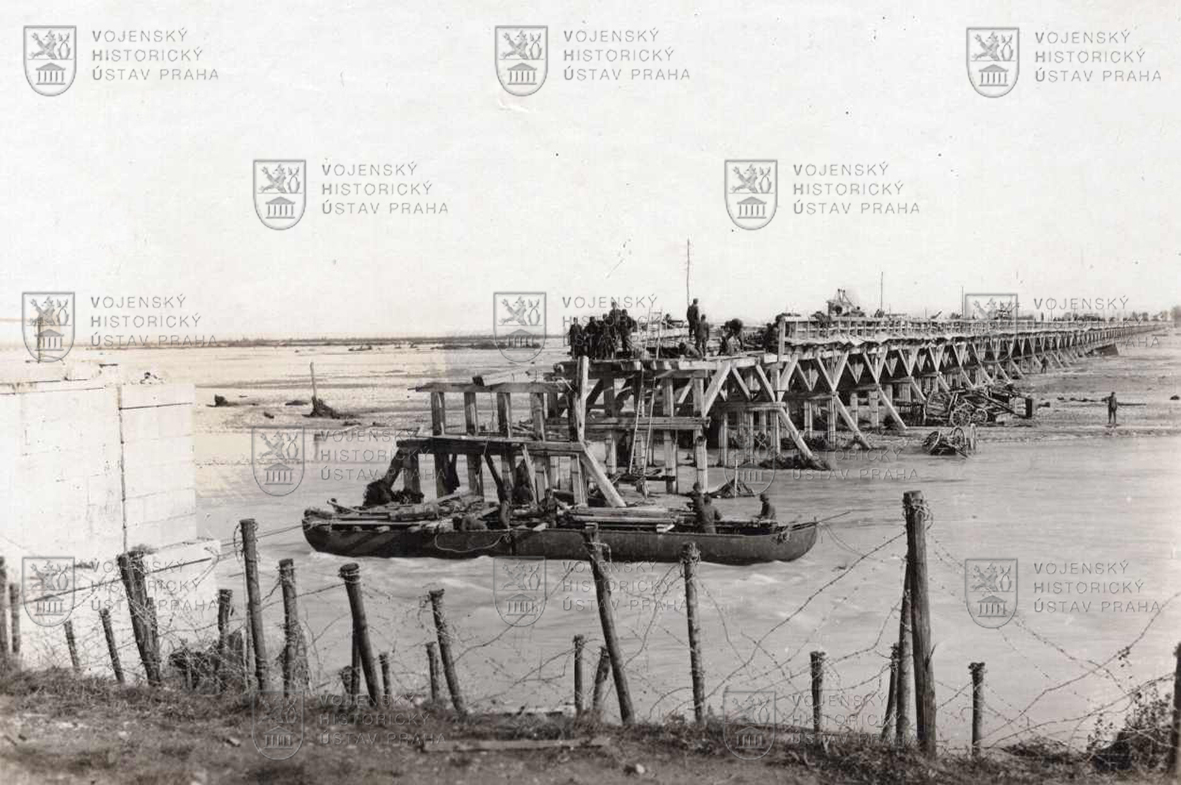 Snímek zachycuje opravu Italy zničeného mostu přes řeku Tagliamento po průlomu u Caporetta během první světové války.