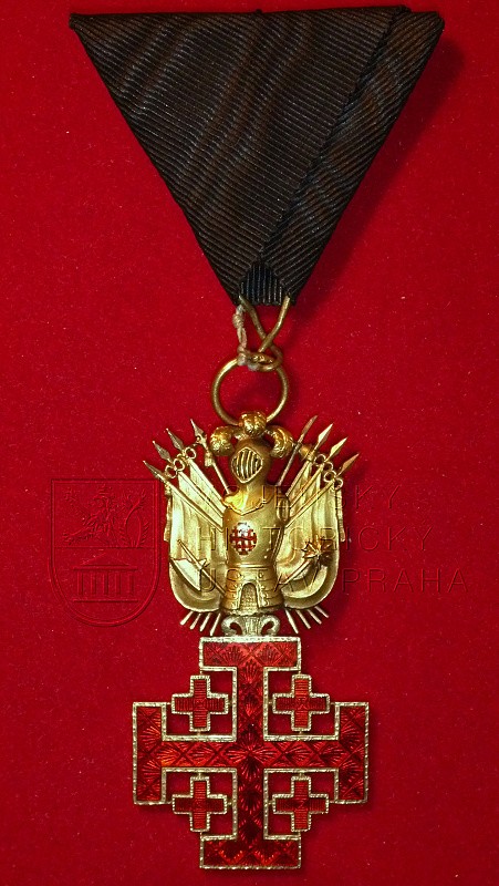 Kopie řádové dekorace v podobě vypouklé hvězdy zlatavé barvy se stříbřitým středovým medailonem o maximálním rozpětí cípů…