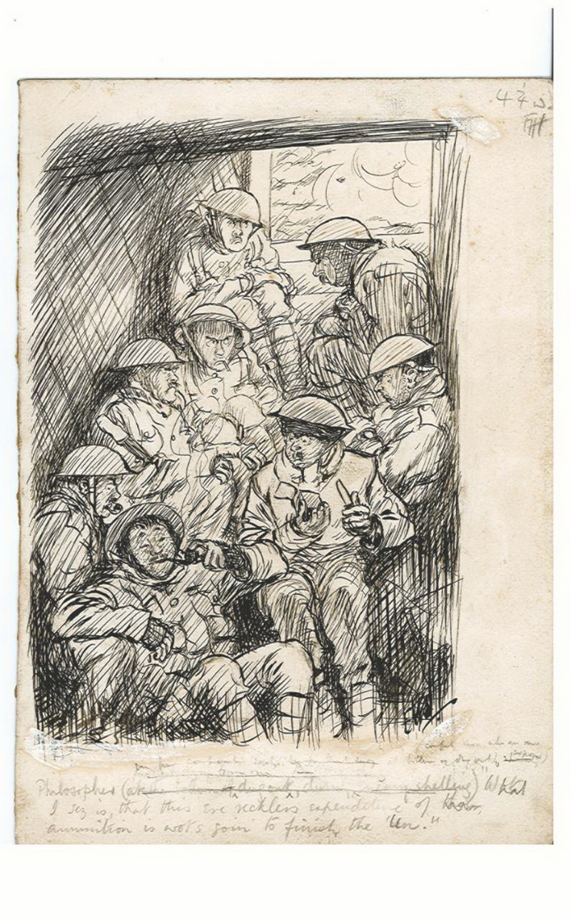 Ve svých kresbách ztvárnil zdevastovanou krajinu na západní frontě, postavení dělostřeleckých baterií, zachytil také první britské tanky v bitvě na Sommě i válečné uprchlíky v Itálii. V závěru výstavy však nechyběla ani jeho kresbička medvídka Pú.