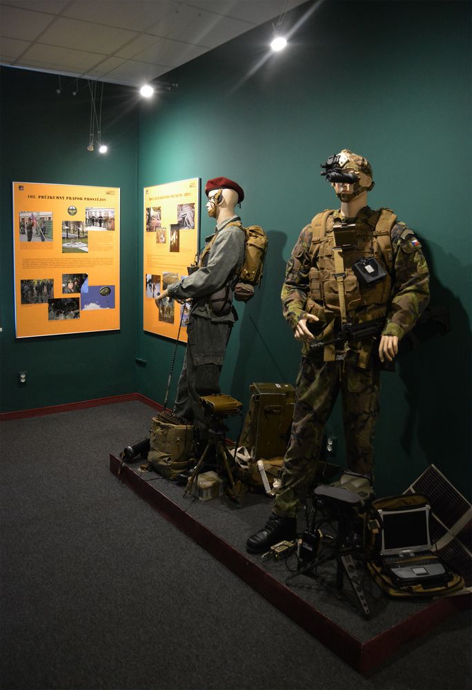 Netradičně pojatá expozice (musela být zachována možnost nadále využívat prostory jako konferenční místnost) představuje bohatou historii průzkumných jednotek československé a české branné moci od jejich vzniku v průběhu druhé světové války až po současnost. Cílem je seznámit zájemce s dobou vzniku prvních průzkumných jednotek, jejich vývojem a tradicemi, k nimž se příslušníci 102. pzpr hrdě hlásí.