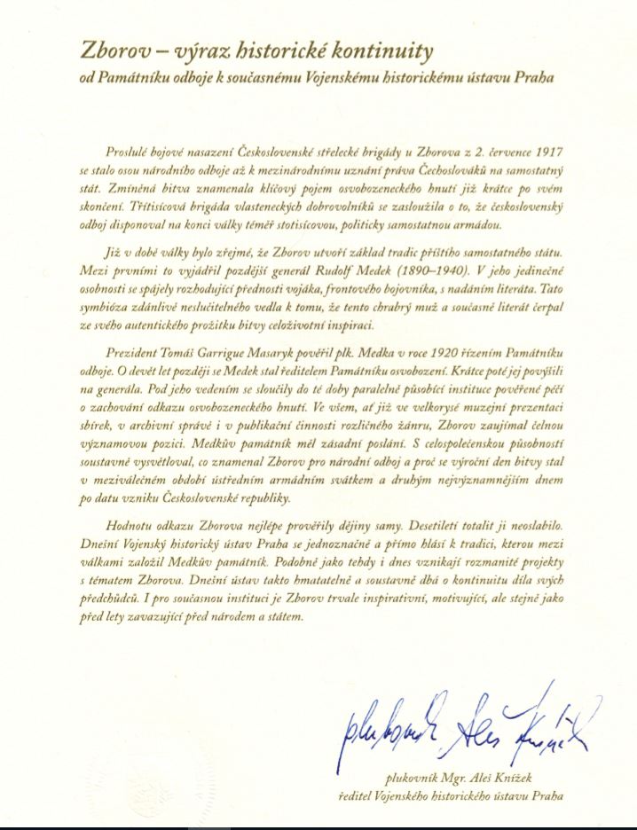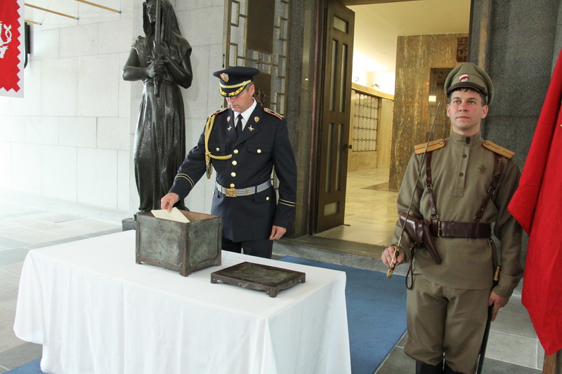 Na pražském Vítkově proběhl slavnostní akt vložení poselství představitelů České republiky do pamětní schránky, která je určena pro Bratrskou mohylu v Kalynivce. Mohyla nacházející se nyní území západní Ukrajiny připomíná bitvu u Zborova v roce 1917, která měla klíčový význam pro vznik Československa. Aktem na Vítkově také byly zahájeny oslavy stoletého výročí zborovské bitvy, které se odehrála 1. - 2. července 1917.